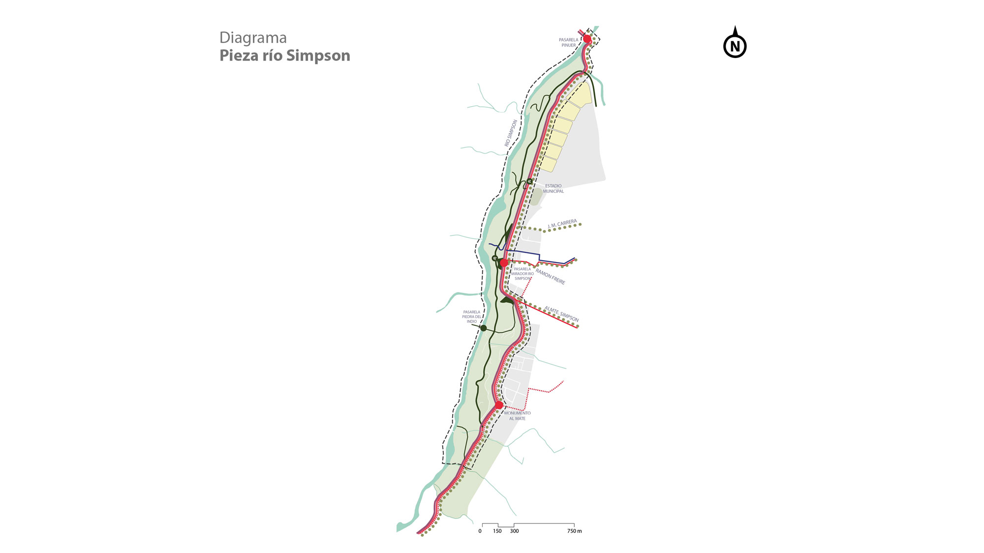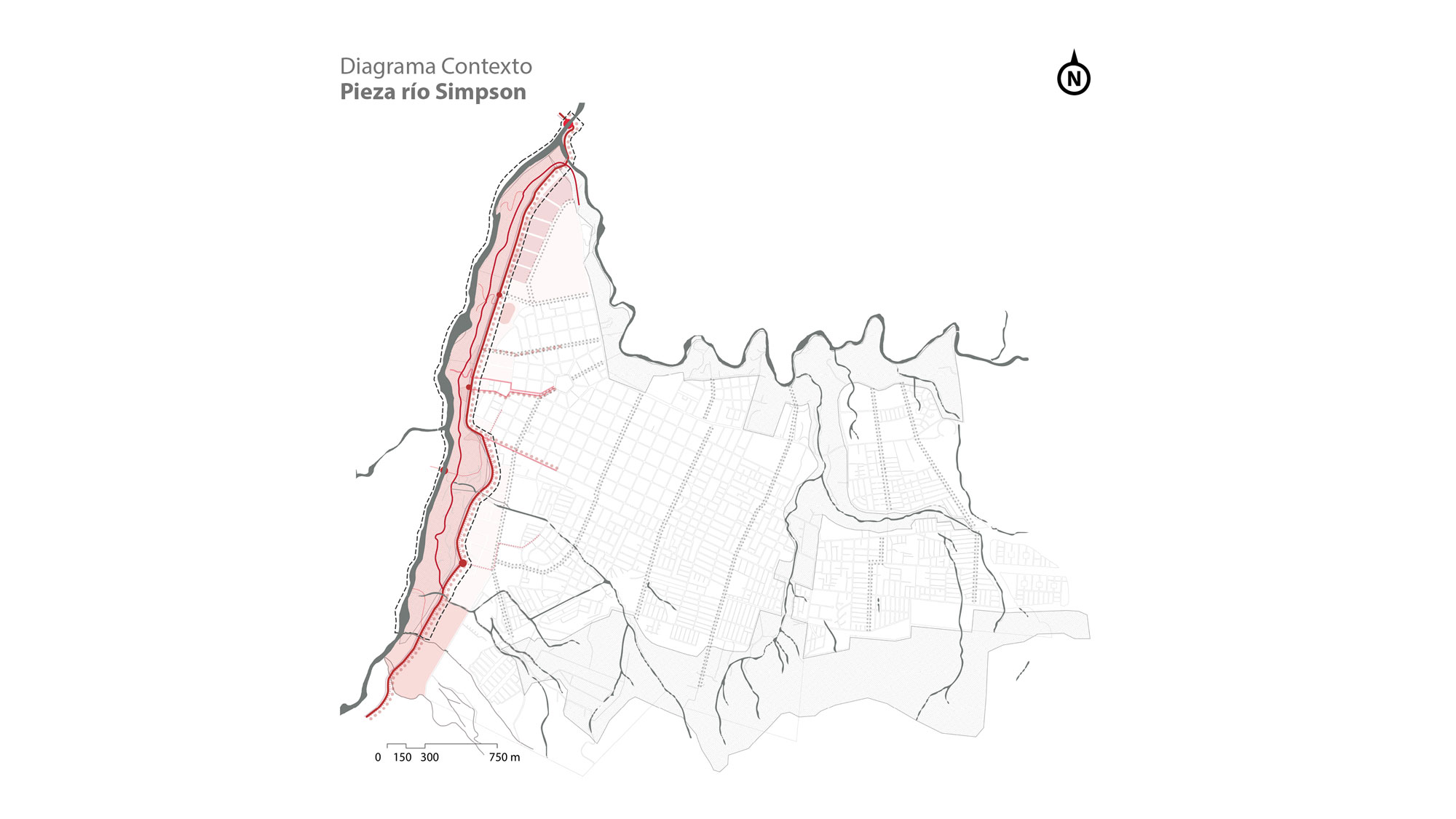 Esta pieza se presenta como borde poniente de la ciudad y se dispone en dirección norte – sur, abarcando la zona de transición entre la trama urbana y Río Simpson.